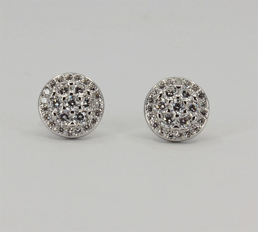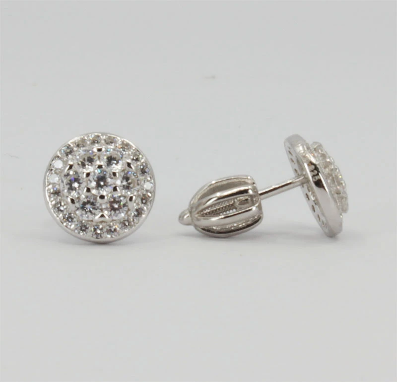 Stříbrné náušnice pecky na šroubek. Náušnice jsou vyrobené ze stříbra ryzosti 925/000. Povrch náušnic porhodiovaný ozdobený prvotřídními zirkony. Úprava rhodiováním dodává náušnicím jasnou barvu s leskem, zvyšuje odolnost povrchu proti poškrábání a zamezuje přirozené oxidaci stříbra, náušnice tak budou mít po dlouhou dobu bezvadný vzhled. Průměr náušnic 8 mm. Náušnicové zapínání je na praktický šroubek.