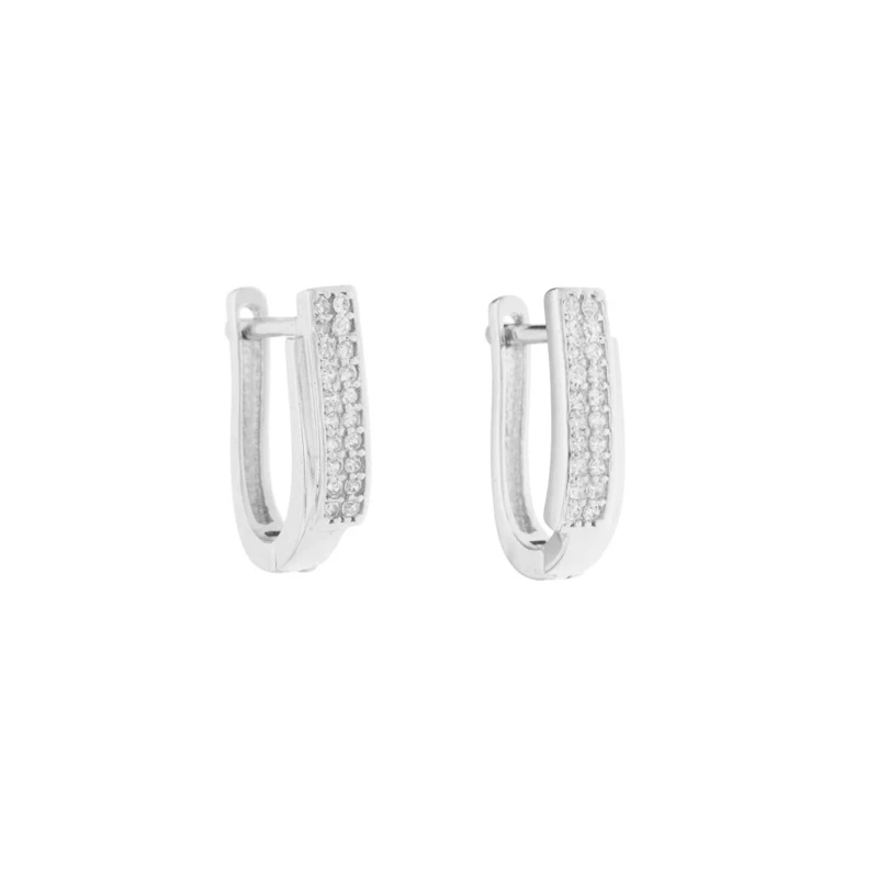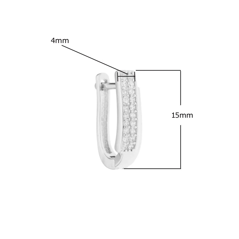 Visací náušnice vyrobené z kvalitního stříbra 925/1000. Náušnice jsou osazené prvotřídními zirkony. Povrch náušnic je porhodiovaný, což jim dodává jasnou barvu s leskem, potlačuje přirozenou oxidaci stříbra, zvyšuje odolnost povrchu proti poškrábání a zaručuje dlouhodobý bezvadný vzhled náušnic. Náušnice jsou široké 4 mm, velikost náušnic 15 mm. Náušnicové zapínání je na ruský patent.