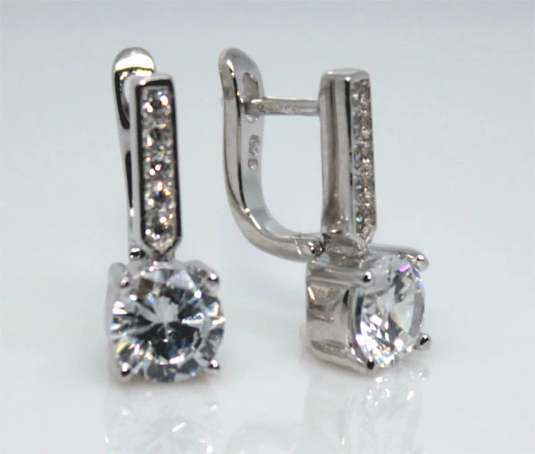 Stříbrné náušnice se zirkony. Povrch náušnic je porhodiovaný. Povrch upravený rhodiem má jasnou barvu a lesk. Rhodium současně zamezuje přirozené oxidaci stříbra. Zirkony mají průměr 6mm, celkový rozměr náušnice 15x6mm, rozměr náušnicového zapínání 6x5mm.
