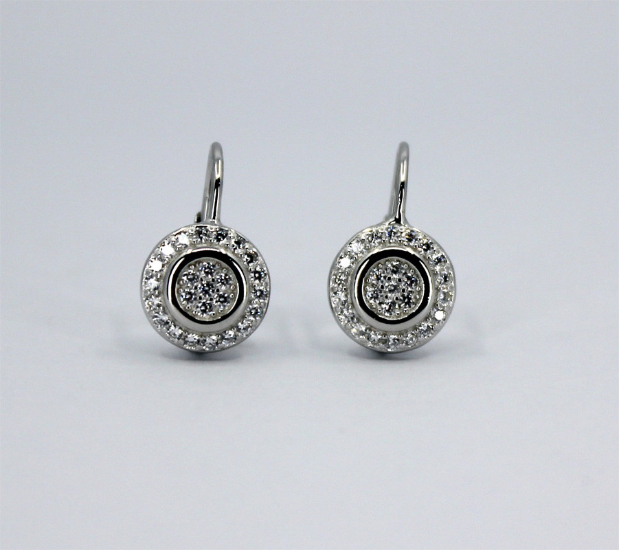 Stříbrné visací náušnice se zirkony. Náušnice jsou vyrobené ze stříbra ryzosti 925/1000 a osazené jsou prvotřídními zirkony. Povrch náušnic je porodiovaný. Nanesené rodium dodává náušnicím jasnou barvu s leskem, a současně zajišťuje dlouhodobý bezchybný vzhled náušnic. Náušnicové zapínání je na klapku. Náušnice jsou "vysoké" 15mm, průměr kulaté ozdoby se zirkony 10mm.