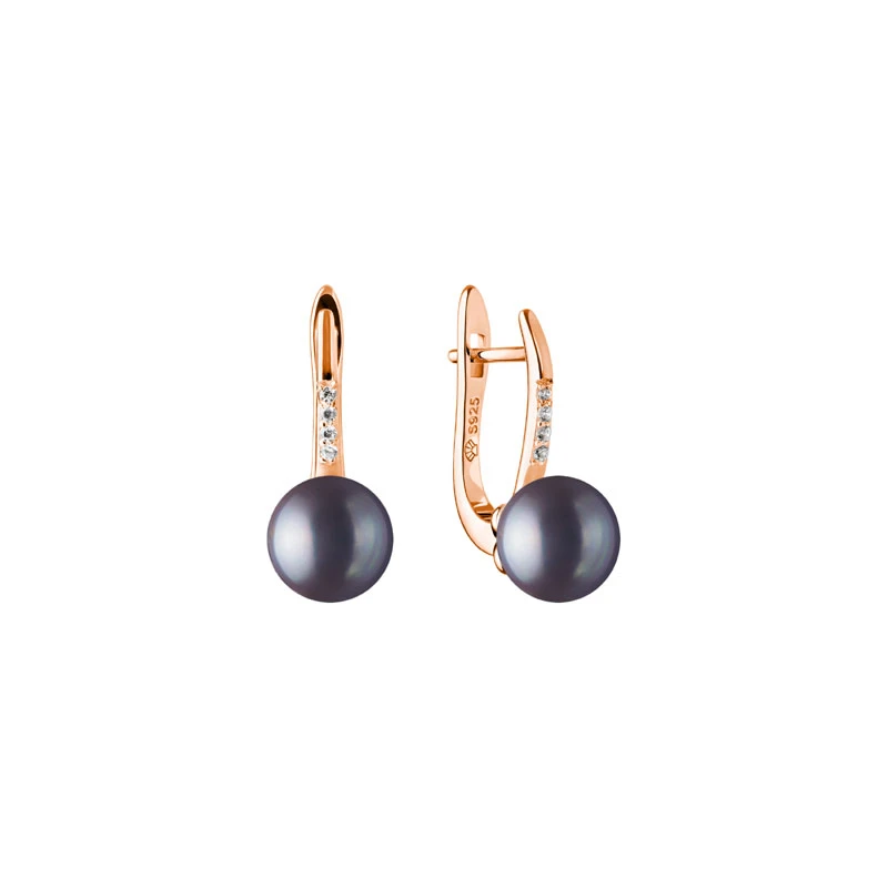 Pozlacené visací náušnice ozdobené říčními perlami a zářivými zirkony. Náušnice jsou vyrobené ze stříbra 925/1000, pozlacené 14k růžovým zlatem. Říční perla má průměr 8 mm. Rozměr náušnic 19x8 mm. Náušnicová zapínání je na ruský patent.