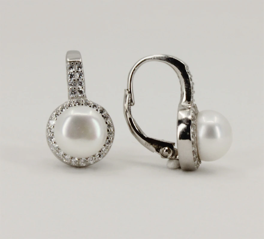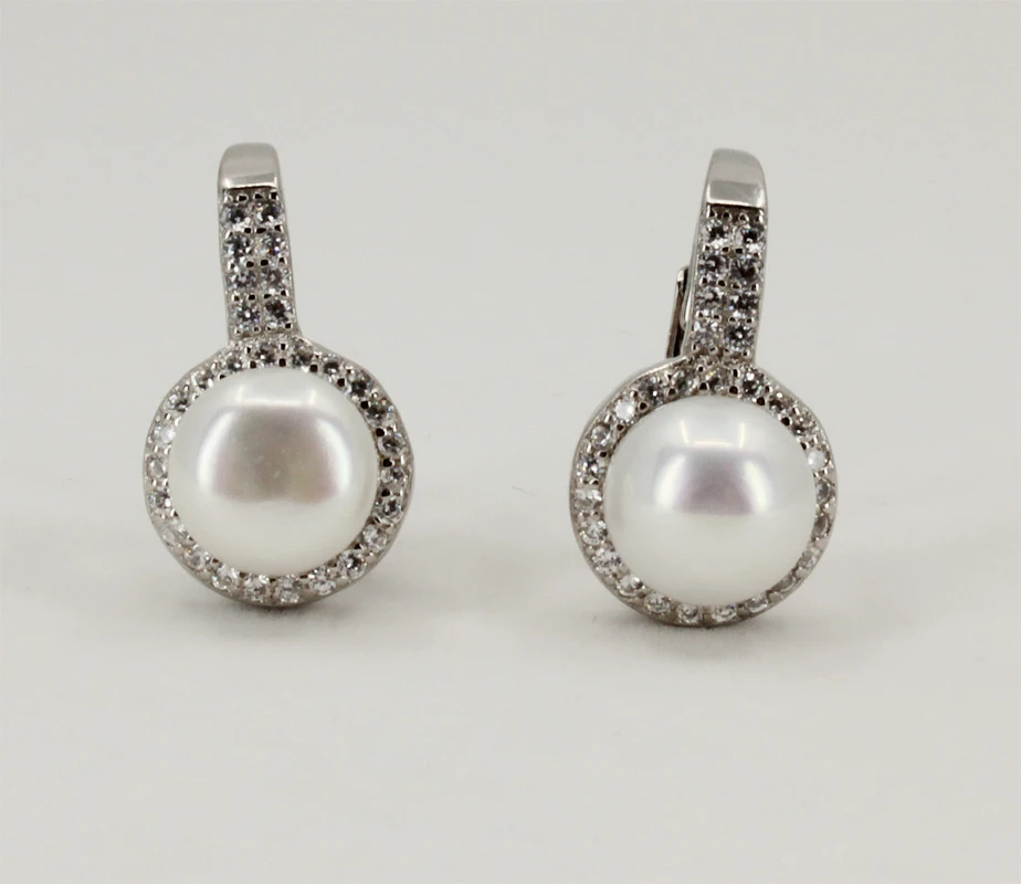 Stříbrné visací náušnice s perlami a zirkony. Náušnice jsou vyrobené ze stříbra ryzosti 925/1000 a osazené jsou přírodními perlami a prvotřídními zirkony. Povrch náušnic je porodiovaný. Nanesené rodium dodává náušnicím jasnou barvu s leskem, a současně zajišťuje dlouhodobý bezchybný vzhled náušnic. Náušnicové zapínání je na klapku. Rozměry náušnice 17x14x10mm.