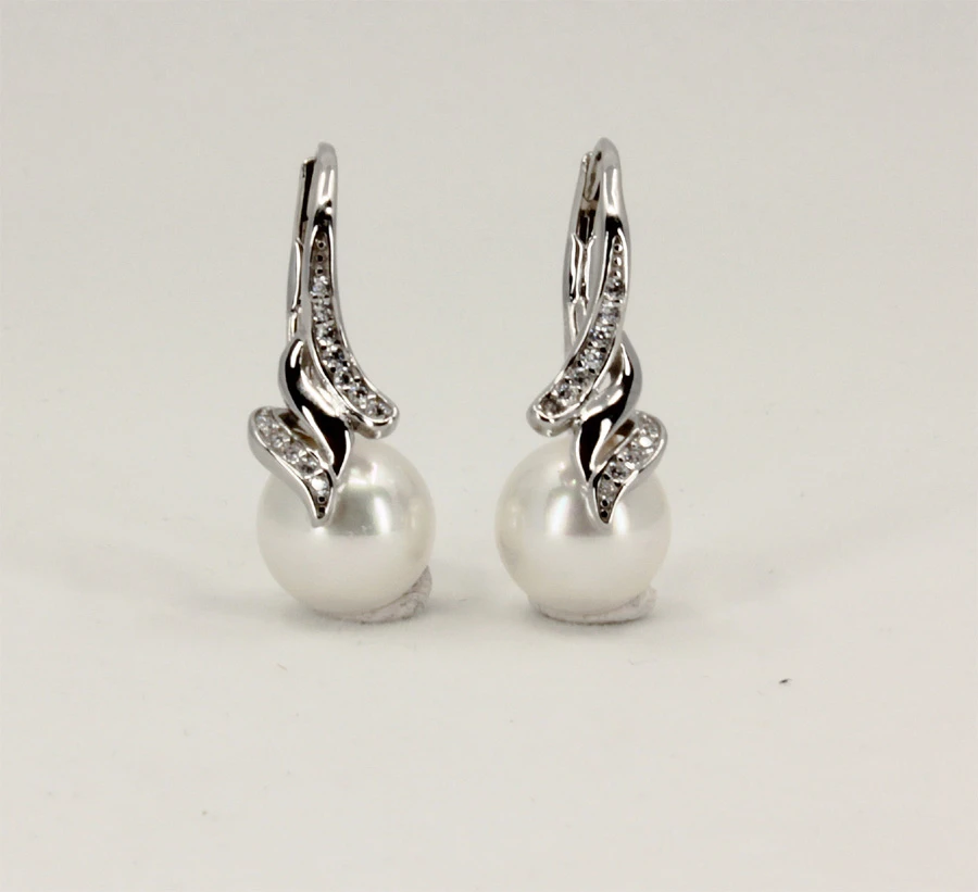 Stříbrné visací náušnice s perlami a zirkony. Náušnice jsou vyrobené ze stříbra ryzosti 925/1000 a osazené jsou přírodními perlami a prvotřídními zirkony. Povrch náušnic je porodiovaný. Nanesené rodium dodává náušnicím jasnou barvu s leskem, a současně zajišťuje dlouhodobý bezchybný vzhled náušnic. Náušnicové zapínání je na klapku. Rozměry náušnice 24x11x8mm.