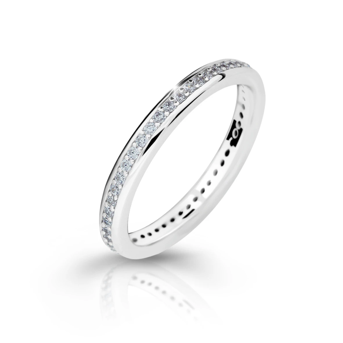 Stříbrný prsten se zirkony Cerafi. Prstýnek je vyrobený ze stříbra 925/1000. Povrch prstýnku je porhodiovaný. Úpraca rhodiem dodává prstýnku jasnou barvu a lesk. Krásný stříbrný prstýnek s kubickými zirkony široký 3mm.