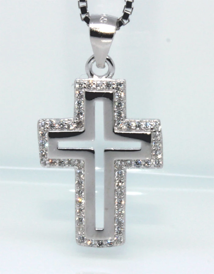 Stříbrný přívěsek křížek se zirkony. Křížek má porhodiovaný povrch, takto upravený povrch dodává křížku jasnou barvu a lesk podtrženou zářivými zirkony. Očkem pro zavěšení křížku lze provléct stříbrný řetízek s průměrem do 3,0 mm. Rozměr křížku 21x15 mm.