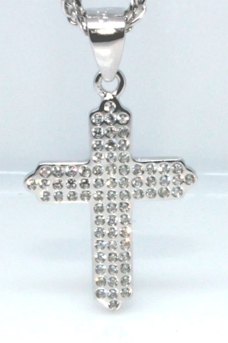 Stříbrný křížek se zirkony. Křížek má porodiovaný povrch. Nanesené rodium dodává přívěsku jasnou barvu a lesk. Rodium současně zamezuje přirozené oxidaci stříbra. Závěsným očkem na přívěsku je možné protáhnout stříbrný řetízek s průměrem do 3,5 mm. Rozměr křížku 23x15 mm.