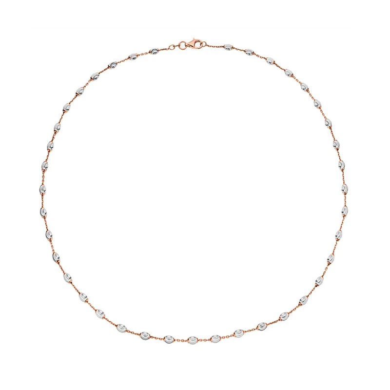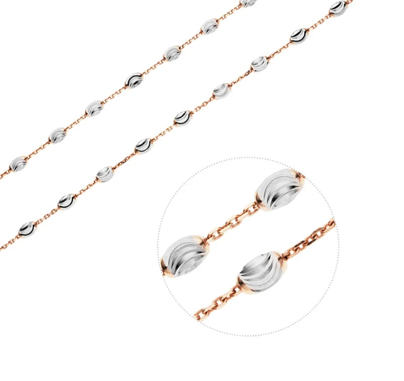 Náhrdelník pro ženy vyrobený ze stříbra 925/1000. Povrch náhrdelníku je pozlacený růžovým zlatem a porhodiovaný. Oválné články jsou porhodiované , řetízkové části náhrdelníku jsou pozlacené. Ovální články mají rozměr 6x3mm, řetízkové mají průměr 1,0mm. Zapínání náhrdelníku je na karabinku.