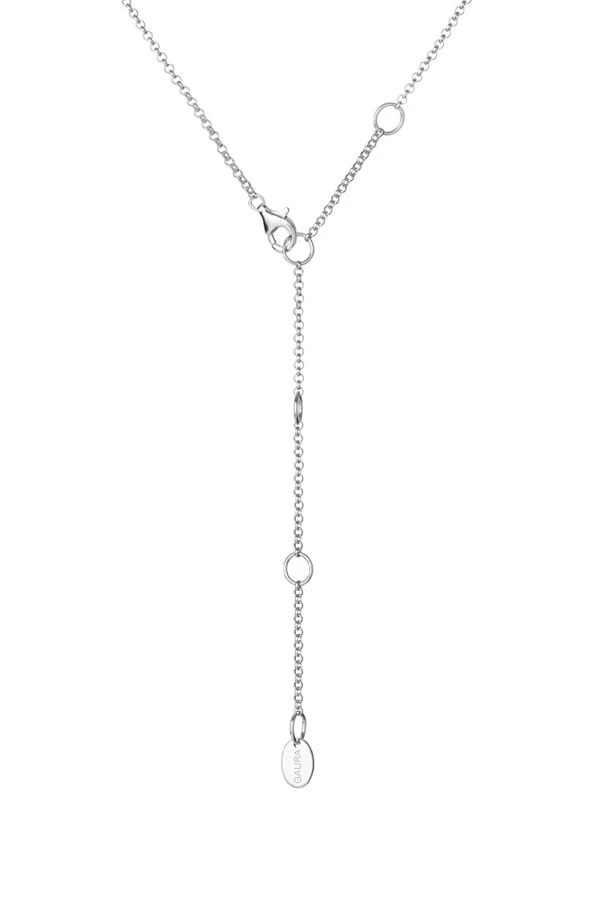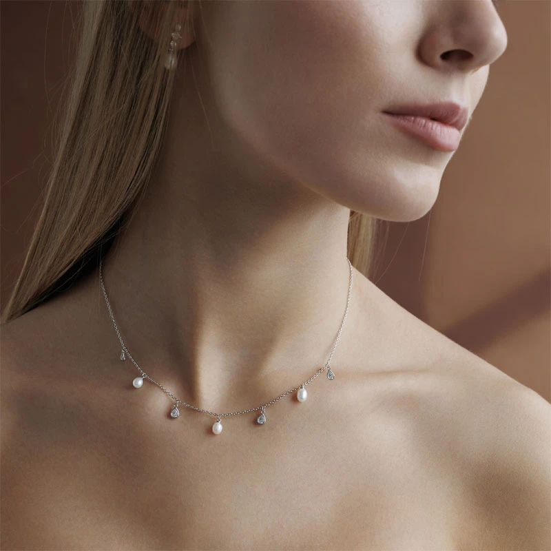 Náhrdelník ze stříbra 925/1000 ozdobený sladkovodními perlami a zářivými zirkony. Náhrdelník tvoří jemný stříbrný řetízek široký 1,0 mm na kterém jsou přivěšené perličky a zirkony. Povrch řetízku je porhodiovaný. Úprava povrchu rhodiem dodává řetízku jasnou barvu s leskem, potlačuje případné alergické reakce a zamezuje přirozené oxidaci stříbra. Sladkovodní perličky mají průměr 5 mm, zirkony ve tvaru slzy jsou široké 4 mm. Náhrdelník lze zapnout na úrovni délek 38,40,42,44,47cm