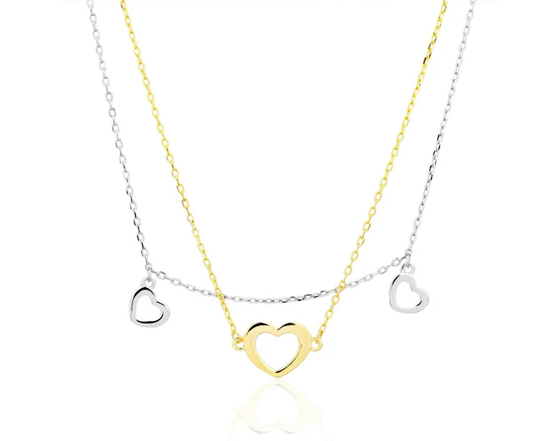 Náhrdelník ze stříbra ryzosti 925/1000. Povrch náhrdelníku je porhodiovaný a zlacený 14K žlutým zlatem. Úprava rhodiováním dodává náhrdelníku jasnou barvu s leskem, chrání povrch šperku proti poškrábání, náhrdelník tak bude mít dlouhou dobu bezvadný vzhled. Řetízky mají průměr 1,0mm, zlaté srdíčko má rozměr 8x10mm, stříbrná srdíčka mají rozměr 7x6mm. Délku náhrdelníku lze nastavit v rozmezí 40-45cm. Zapínání náhrdelníku je na pérový kroužek.