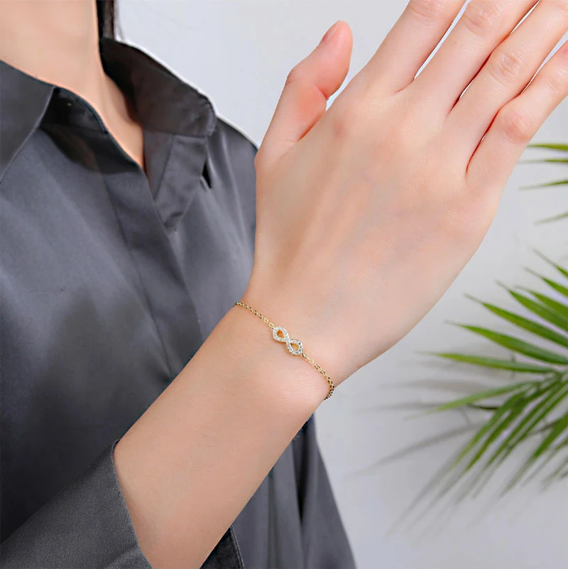 Stříbrný náramek se zirkony je dokonalým doplňkem pro každou ženu. Náramek je vyrobený z kvalitního stříbra 925/1000 a je osazený oslnivými zirkony, které dodávají náramku nádech luxusu. Stříbrný pozlacený náramek se symbolem nekonečna je ideální volbou pro každou příležitost – ať už se chystáte na večerní akci, romantickou večeři nebo chcete vypadat skvěle i v běžném dni. Stříbrný náramek s kamínky může být výjimečným dárkem, který spojí krásu a styl. Neváhejte a pořiďte tento krásný stříbrný náramek pro sebe, nebo pro Vaše blízké.