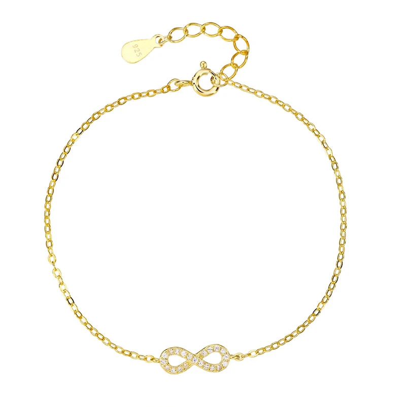 Pozlacený náramek se symbolem nekonečna. Náramek je vyrobený ze stříbra 925/1000 , osazený prvotřídními zirkony. Povrch náramku je pozlacený 14K žlutým zlatem. Symbol nekonečna osazený zářivými zirkony má rozměr 12x5 mm, řetízek je široký 1,0 mm. Délku náramku lze nastavit v rozmezí 16-18 cm , zapínání náramku je na pérový kroužek