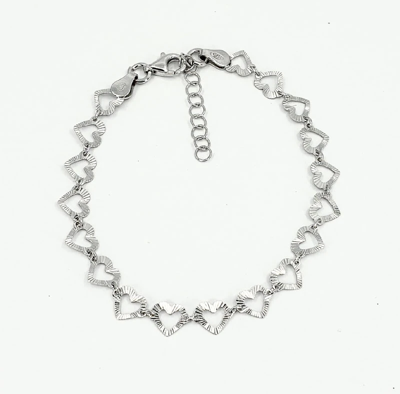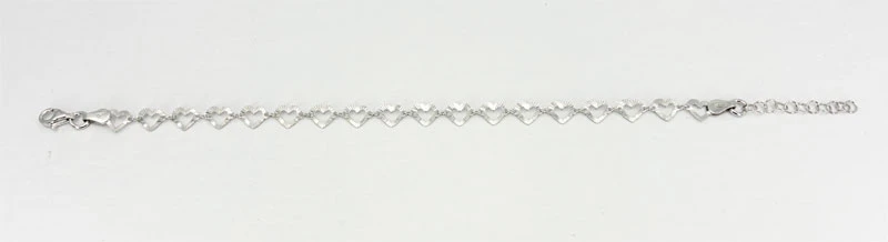 Náramek pro ženy srdíčka vyrobený ze stříbra ryzosti 925/1000. Povrch náramku je porhodiovaný. Úprava rhodiováním dodává náramku jasnou barvu s leskem, chrání povrch náramku proti poškrábání náramek tak bude mít dlouhou dobu bezvadný vzhled. Srdíčka mají rozměr 6x6mm. Náramek má zapínání na karabinku. Délku náramku lze nastavit v rozmezí 17-20cm.