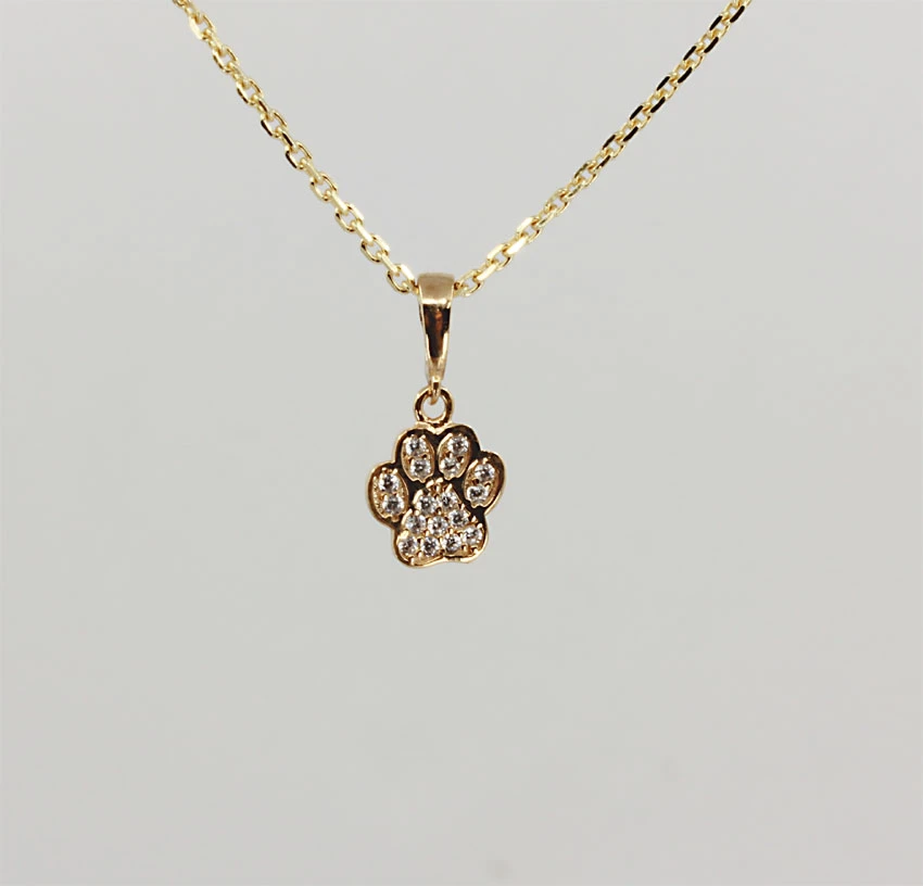 Pozlacený přívěsek na řetízek "psí packa" ozdobený prvotřídními zirkony. Přívěšek je vyrobený ze stříbra ryzosti 925/1000. Rozměr přívěsku 9x8mmmm. Závěsným očkem na přívěsku lze provléct stříbrný řetízek s průměrem do 1,5mm.