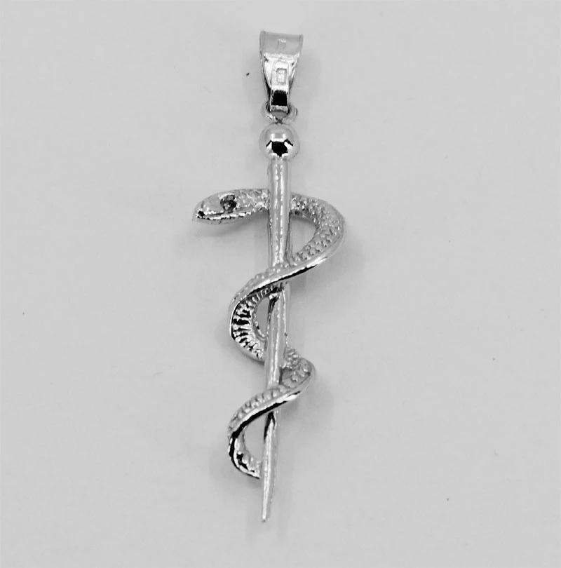 Přívěsek Aeskulapova hůl ze stříbra 925/000. Povrch přívěsku je porhodiovaný. Úprava rhodiováním dodává přívěsku jasnou barvu s leskem, zvyšuje odolnost povrchu proti poškrábání a zamezuje přirozené oxidaci stříbra. Přívěsek tak bude mít po dlouhou dobu bezvadný vzhled. Rozměr hole 35x10 mm. Závěsným očkem na přívěsku lze provléct stříbrný řetízek s průměrem do 3 mm.