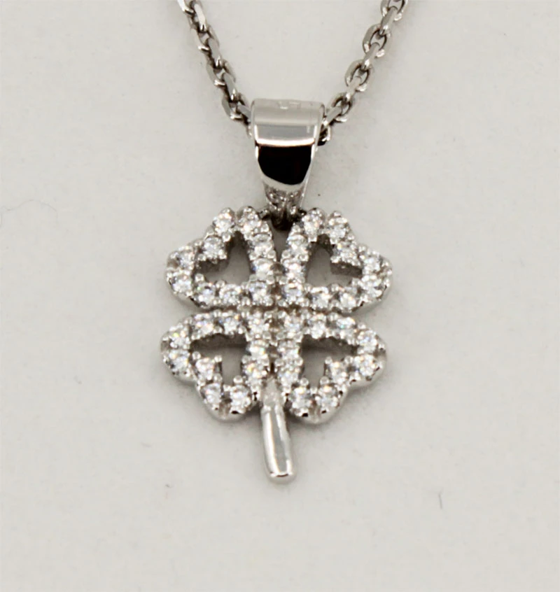 Stříbrný přívěsek na řetízek čtyřlístek ozdobený prvotřídními zirkony. Přívěšek je vyrobený ze stříbra ryzosti 925/1000. Povrch přívěsku je porhodiovaný, úprava rhodiováním zvyšuje odolnost povrchu přívěsku proti poškození a zaručuje dlouhodobý bezchybný vzhled šperku. Rozměr přívěsku 14x11mmmm. Závěsným očkem na přívěsku lze provléct stříbrný řetízek s průměrem do 2,5mm.