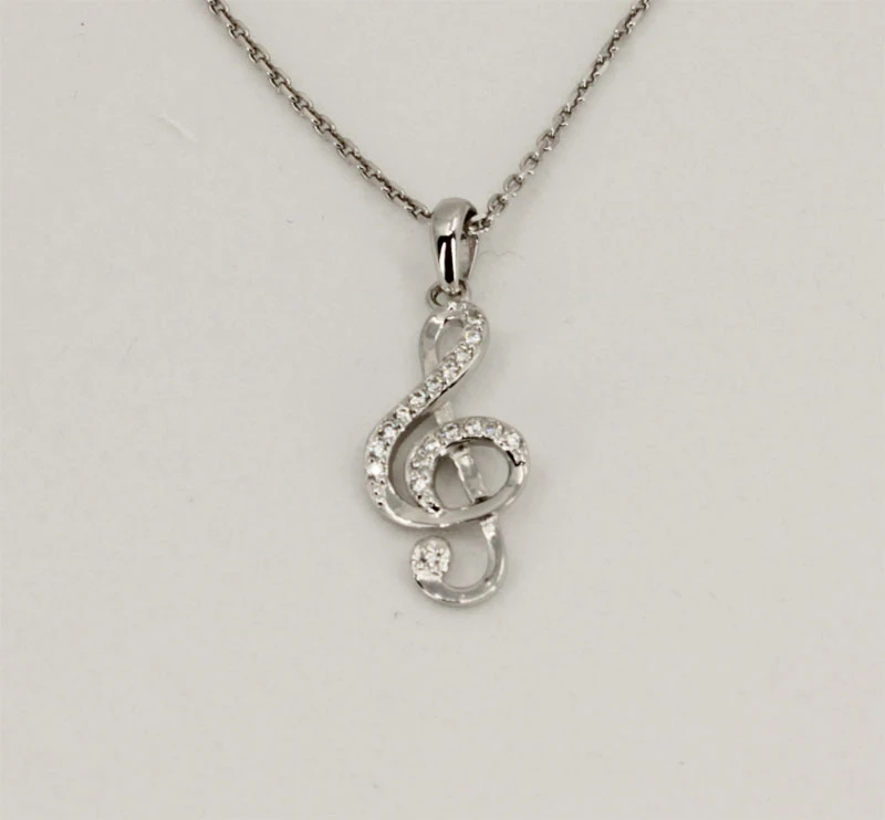 Houslový klíč jako přívěsek na řetízek vyrobený ze stříbra 925/1000. Houslový klíč je navíc osazený zářivými zirkony, které dodávají přívěsku luxusní nádech. Povrch přívěsku je porhodiovaný, nanesané rhodium dodává houslovému klíči jasnou barvu s leskem a zvyšuje odolnost povrchu proti poškrábání. Přívěsek si tak dlouho uchová bezvadný vzhled. Rozměr přívěsku 22x10mm. Závěsným očkem na přívěsku lze protáhnout stříbrný řetízek s průměrem do 2mm.