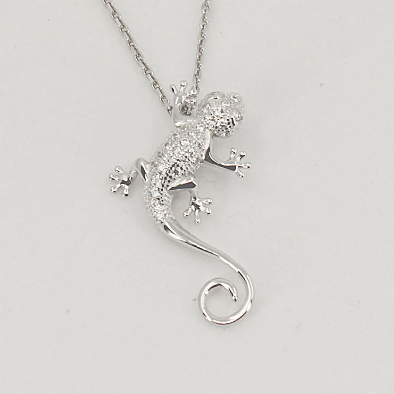 Přívěsek ještěrka ze stříbra 925/1000. Ještěrka je navíc osazena prvotřídními zirkony. Povrch přívěsku je porhodiovaný. Úprava rhodiováním dodává přívěsku jasnou barvu s leskem, zvyšuje odolnost povrchu proti poškrábání a zamezuje přirozené oxidaci stříbra. Přívěsek tak bude mít po dlouhou dobu bezvadný vzhled. Rozměr ještěrky 23x23 mm. Závěsným očkem na přívěsku lze provléct stříbrný řetízek s průměrem do 3 mm.