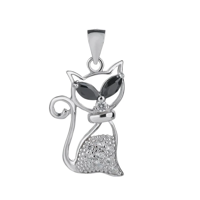 Přívěsek sedící kočka za stříbra 925/1000. Kočička je navíc osazena prvotřídními zirkony. Povrch přívěsku je porhodiovaný. Úprava rhodiováním dodává přívěsku jasnou barvu s leskem, zvyšuje odolnost povrchu proti poškrábání a zamezuje přirozené oxidaci stříbra. Přívěsek tak bude mít po dlouhou dobu bezvadný vzhled. Rozměr kočky 15x24 mm. Závěsným očkem na přívěsku lze provléct stříbrný řetízek s průměrem do 3 mm.
