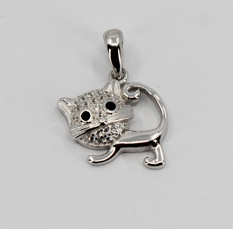 Přívěsek kočka ze stříbra 925/1000. Kočička je navíc osazena prvotřídními zirkony. Povrch přívěsku je porhodiovaný. Úprava rhodiováním dodává přívěsku jasnou barvu s leskem, zvyšuje odolnost povrchu proti poškrábání a zamezuje přirozené oxidaci stříbra. Přívěsek tak bude mít po dlouhou dobu bezvadný vzhled. Rozměr kočky 16x13 mm. Závěsným očkem na přívěsku lze provléct stříbrný řetízek s průměrem do 3 mm.
