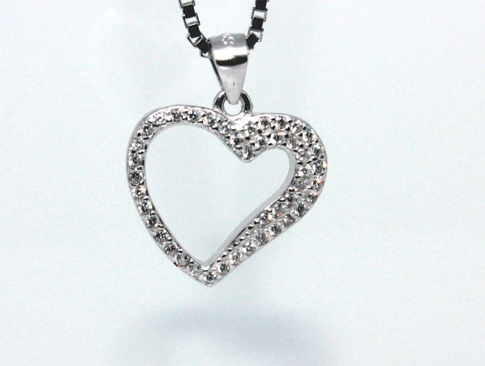 Stříbrný přívěšek srdce. Přívěšek má porhodiovaný povrch. Rhodium dodává přívěsku jasnou barvu s leskem. Očkem na přívěsku lze provléct stříbrný řetízek s maximálním průměrem 3,0 mm. Rozměr přívěsku 13x14 mm.