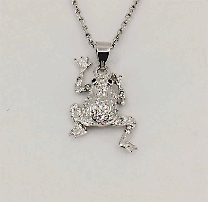 Přívěsek žába ze stříbra 925/1000. Žába je navíc osazena prvotřídními zirkony. Povrch přívěsku je porhodiovaný. Úprava rhodiováním dodává přívěsku jasnou barvu s leskem, zvyšuje odolnost povrchu proti poškrábání a zamezuje přirozené oxidaci stříbra. Přívěsek tak bude mít po dlouhou dobu bezvadný vzhled. Rozměr žáby 18x14 mm. Závěsným očkem na přívěsku lze provléct stříbrný řetízek s průměrem do 2,5 mm.