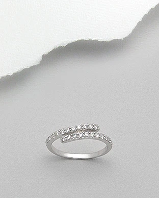Prsten ze stříbra 925. Prsten je zdobený zirkony. Obroučka prstenu je široká 2mm v místě kde se obroučka rozdvojuje je prsten široký 5mm. Povrch prstenu je porodiovaný.