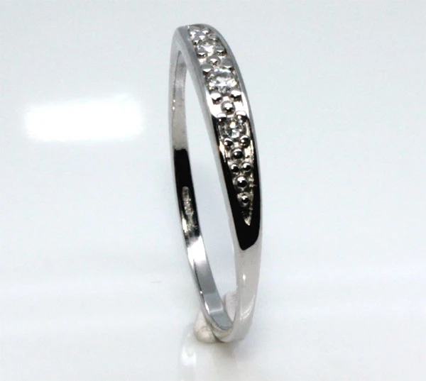Stříbrný prstýnek se zirkony ze stříbra 925/000. Prsten má povrch upravený rhodiem. Úprava rhodiováním dodává prstýnku jasnou barvu a luxusní vzhled. Prstýnek je v nejširším bodě široký 3,0 mm naopak v nejužším bodě obroučky 1,2 mm.