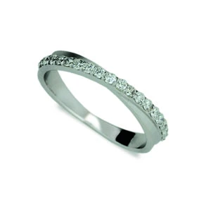 Stříbrný prstýnek ozdobený zirkony. Prstýnek má porhodiovaný povrch. Nanesené rhodium dodává prstýnku zářivou barvu a lesk. Šířka prstýnku je 2,0 mm v nejužším bodě a postupně se rozšiřuje na 3,5 mm v nejširším bodě ozdoby.