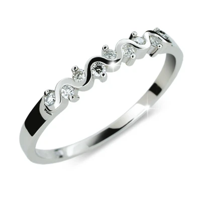 Stříbrný prstýnek ozdobený zirkony. Prstýnek má porhodiovaný povrch. Nanesené rhodium dodává prstýnku zářivou barvu a lesk. Šířka prstýnku 2,0 mm.