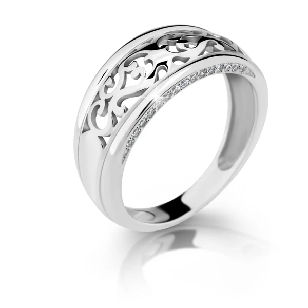Stříbrný prstýnek ozdobený zirkony. Prstýnek má porhodiovaný povrch. Nanesené rhodium dodává prstýnku zářivou barvu a lesk. Šířka prstýnku je 3,0 mm v nejužším bodě a postupně se rozšiřuje na 8,0 mm v nejširším bodě ozdoby.