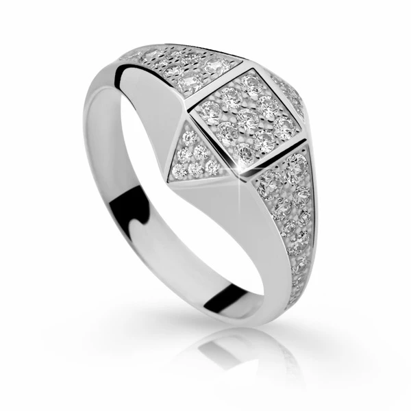 Prsten ze stříbra 925/000. Prsten má porhodiovaný povrch zdobený zirkony. Nanesené rhodium dává prstenu nádhernou barvu a odlesk. Prsten je široký 11mm v nejširším bodě, 3mm v nejužším bodě. Krásný dámský stříbrný prsten se zirkony.