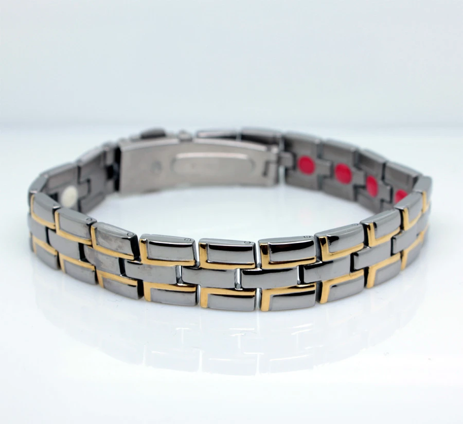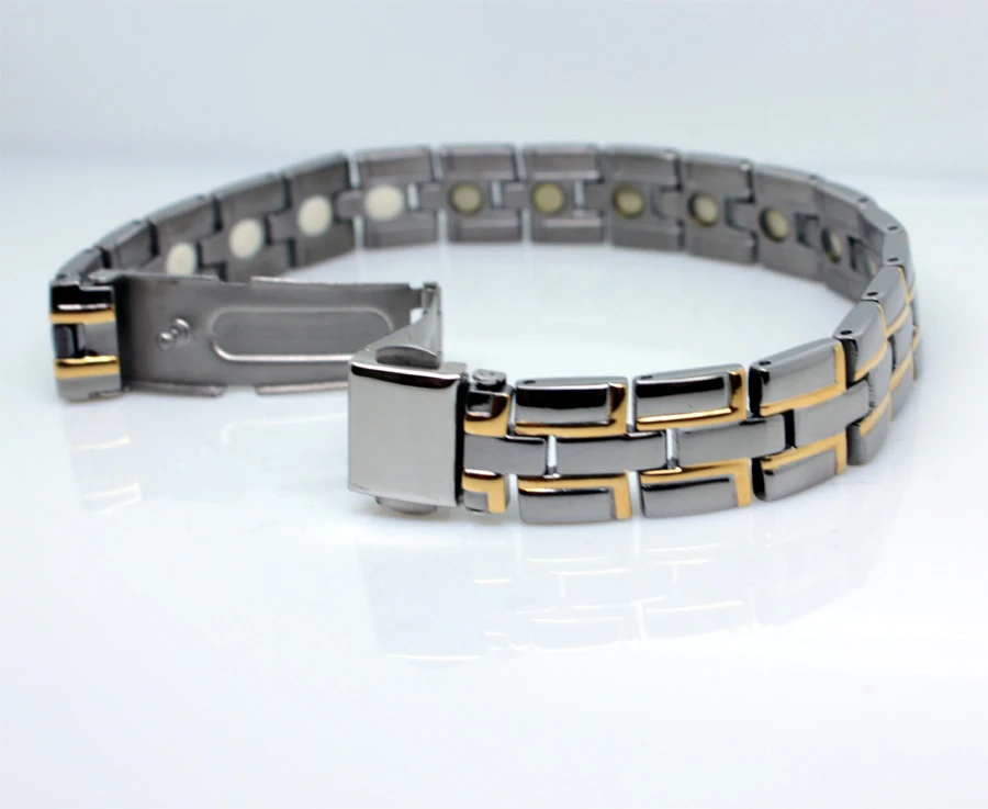 Zdravotní náramek z titanu. Povrch náramku je leštěný s pozlacenými linkami. Náramek je široký 12mm, délka náramku 21cm. Zapínání náramku je na složenou sponu a náramek se tak snadno nandává i sundává. Díky použitému titanu je náramek velmi lehký a pohodlně se nosí. Délku náramku lze na přání zdarma zkrátit.