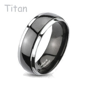 Titanový prsten. Povrch prstenu je černý leštěný. Okraje prstenu jsou leštěné. Ve velikostech 49–57 je prsten široký 6mm, ve velikostech 59–70 je prsten široký 8mm. Hezký titanový prsten, který lze použít jako snubní.