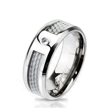 Prsten z titanu. Prsten má leštěný povrch zdobený karbonem. Prsten je osazený zirkonem. Šířka prstenu: 8mm. Pěkný pánský titanový prsten.
