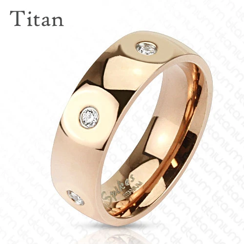 Titanový prsten. Prsten má leštěný povrch zdobený zirkony. Prsten má upravený povrch zlatou IP barvou. Šířka prstenu 6mm. Hezký titanový prsten.
