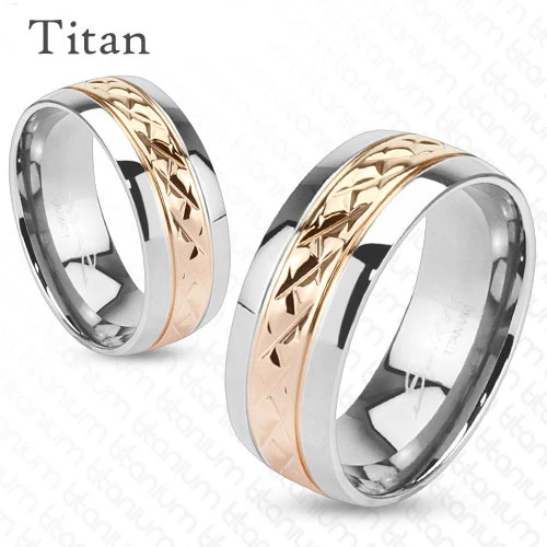 Titanový prsten se vzorem. Střed prstenu má barvu růžového zlata, kraje jsou leštěné.Ve velikostech 49–57 jsou prsteny široké 6mm, ve velikostech 59–70 jsou prsteny široké 8mm. Krásné titanové prsteny pro dva, které je možné použít jako snubní.
