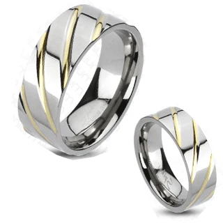 Prsten z titanu.Prsten má leštěný povrch. Prsten má po obvodě příčné pozlacené drážky.Prsten lze použít jako snubní. Ve velikostech 49–57 je prsten široký 6mm, ve velikostech 59–70 je prsten široký 8mm. Krásný titanový prsten.