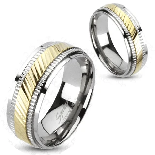 Prsten z titanu. Prsten má pozlacený střed s drážkami. Okraje prstenu jsou leštěné. Ve velikostech 49–57 je prsten široký 6mm, ve velikostech 59–69 je prsten široký 8mm. Krásný titanový prsten. Prsten lze použít jako snubní.