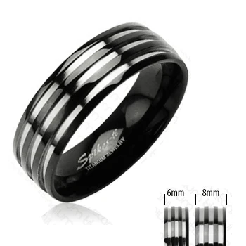 Prsten z titanu. Prsten má černou PVD barvu. Prsten má po obvodě 3 leštěné linky. Ve velikostech 49–57 je prsten široký 6mm, ve velikostech 59–73 je prsten široký 8mm. Prsteny lze použít jako snubní.