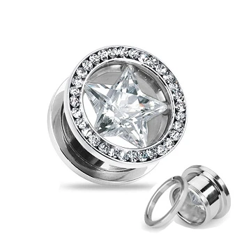 Piercing do ucha. Piercing „tunel“. Piercing je ozdobený zářivými kamínky. Piercing pro roztažení ucha.