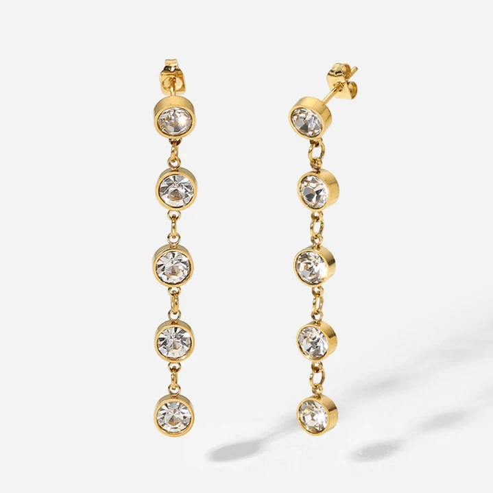 Dlouhé náušnice z chirurgické oceli ozdobené zářivými zirkony. Povrch náušnic je pozlacený technologií PVD. Zářivé zirkony mají průměr 6mm. Délka náušnic 50mm. Náušnicové zapínání je na puzety.