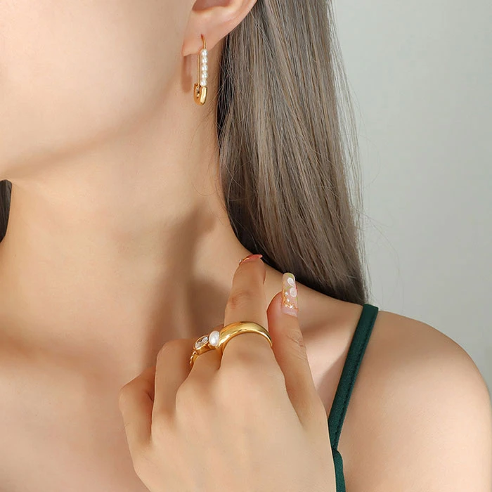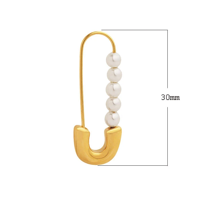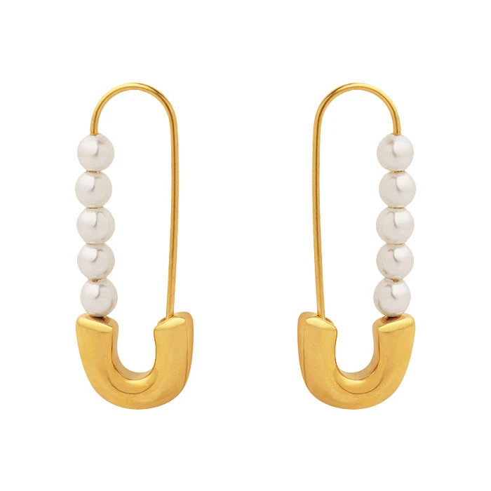 Náušnice z chirurgické oceli napodobující spínací špendlík. Povrch náušnic je pozlacený technologií PVD. Délka náušnic 30mm. Náušnice zdobí umělé perly.