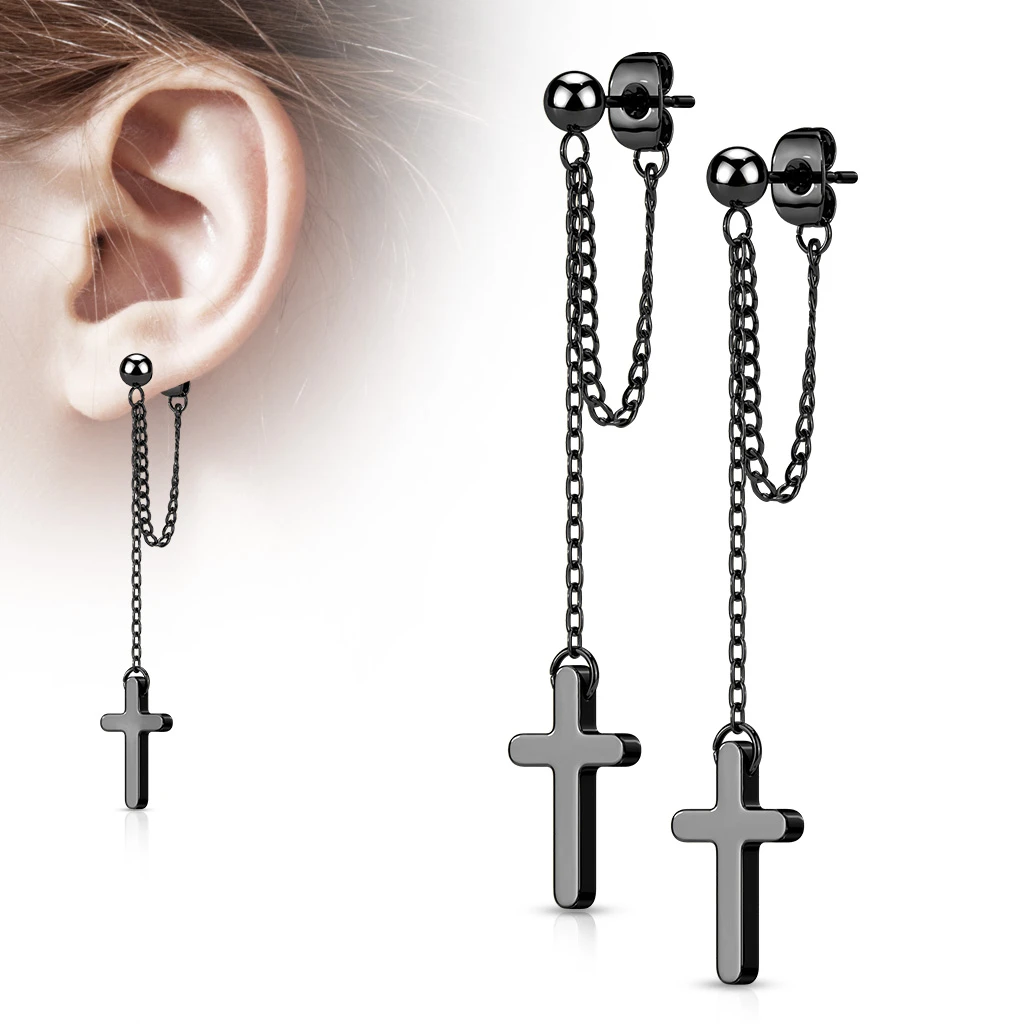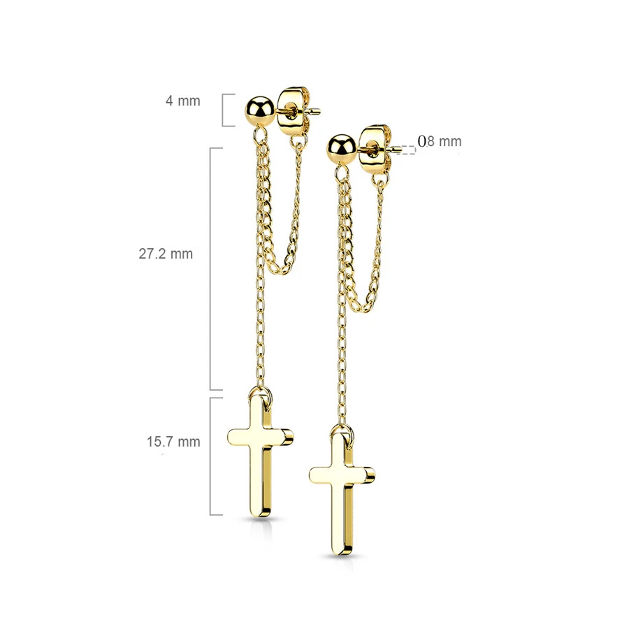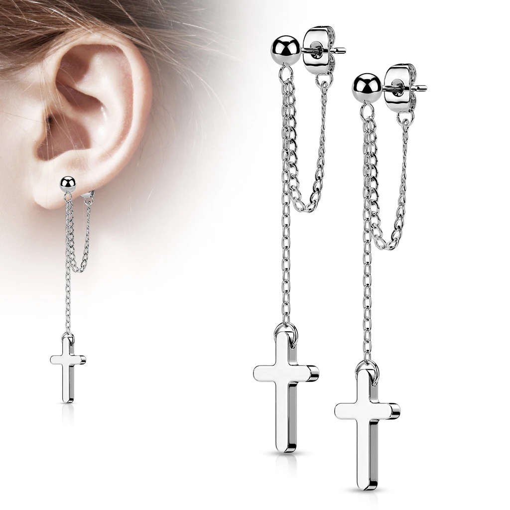 Dlouhé náušnice z chirurgické oceli s řetízkem a křížkem. Náušnice mají zapínání na puzetky. Rozměry náušnic najdete přehledné zobrazené na podpůrném obrázku.