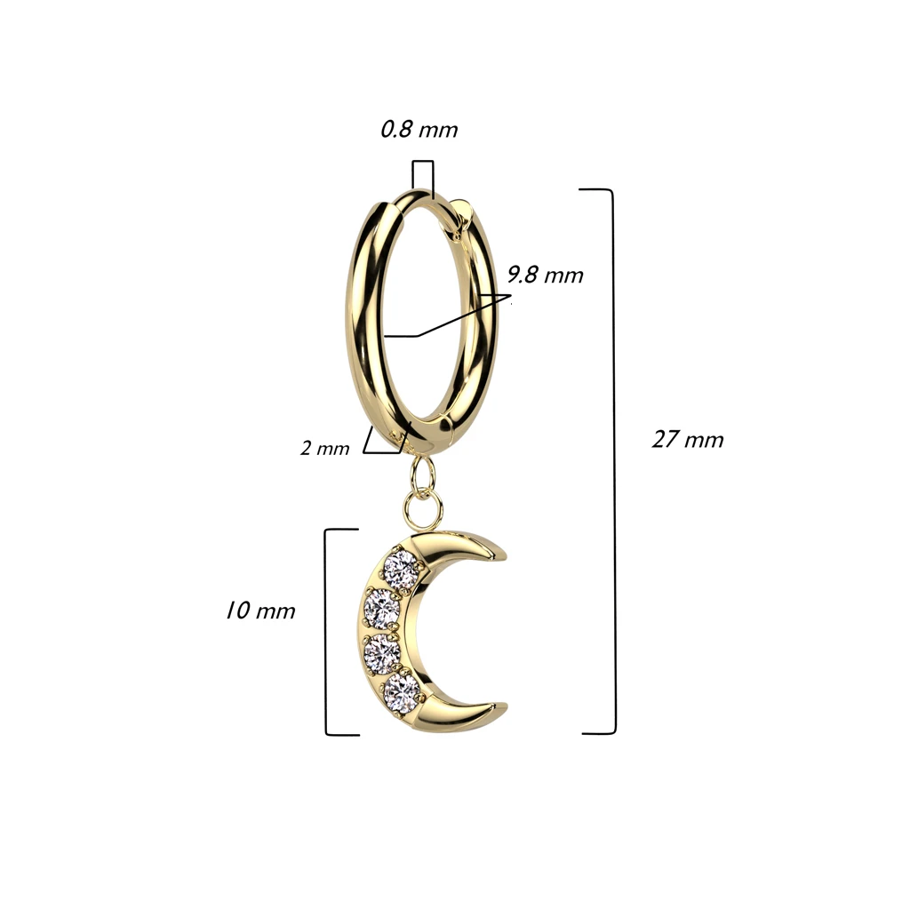 Náušnice z chirurgické oceli kroužky s visací ozdobou srpku měsíce. Jako všechny šperky z chirurgické oceli jsou také tyto visací náušnice odolné proti poškození, nevyvolávají alergické reakce, neoxidují ani nemění barvu.
