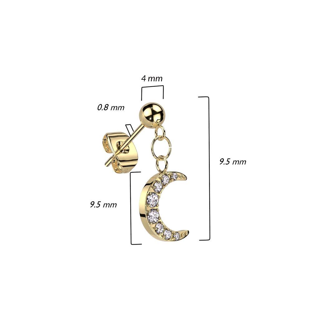 Ocelové visací náušnice s ozdobou srpku měsíce. Povrch náušnic je leštěný, srpek měsíce je ozdobený zářivými zirkony. Rozměry náušnice najdete zobrazené na podpůrné fotografii.