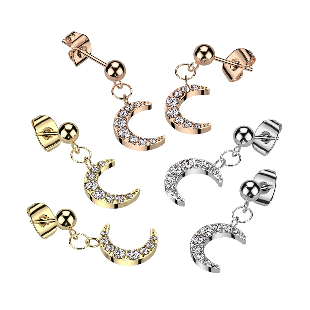 Náušnice z chirurgické oceli pecky s visací ozdobou srpku měsíce. Jako všechny šperky z chirurgické oceli jsou také tyto visací náušnice odolné proti poškození, nevyvolávají alergické reakce, neoxidují ani nemění barvu.