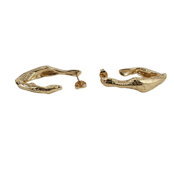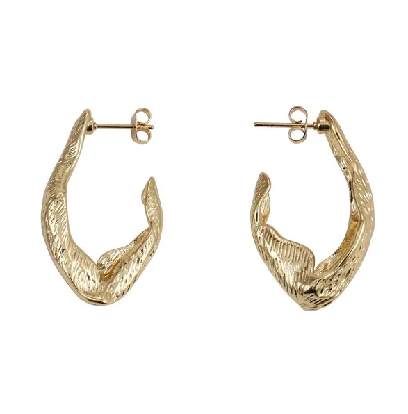 Náušnice visací vyrobené z chirurgické oceli. Pozlacený povrch náušnic je leštěný se vzorem na vnější i vnitřní straně. Netradiční visací náušnice dlouhé 40mm. Náušnicové zapínání je na puzety.