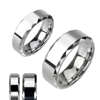 Prsten z wolframu. Prsten má leštěný povrch. Po stranách má prsten plošky. Krásný prsten, který díky odolnosti materiálu není téměř možné poškrábat. Prsten lze použít jako snubní. Ve velikostech 49–57 je prsten široký 6mm, ve velikostech 59–69 je prsten široký 8mm.