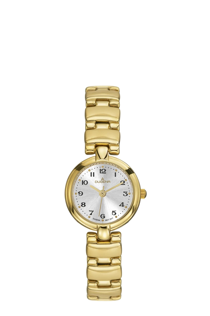 Dámské hodinky Dugena z chirurgické oceli. Sklíčko hodinek je minerální. Kulatý stříbrný ciferník s arabskými čísly. Hodinky jsou vybavené, hodinovou, minutovou a vteřinovou ručkou. Rozměr pouzdra hodinek: průměr 22,7 mm, tloušťka 6,5 mm. Povrch hodinek je pozlacený žlutým zlatem technologií IP. Chod hodinek zajišťuje spolehlivý bateriový strojek. Hodinky jsou vodotěsné na úrovni 3 ATM. Na všechny dámské hodinky Dugena je poskytovaná záruka v délce 36 měsíců. Hodinky jsou dodávané v dárkové krabičce s logem.