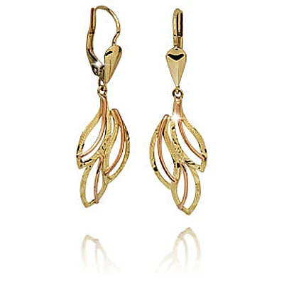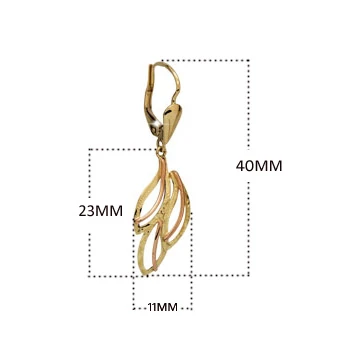 Zlaté visací náušnice ze žlutého a růžového zlata ryzosti 585/1000. Povrch náušnic je leštěný se vzorem. Náušnicové zapínání je na klapku. Celková délka náušnice 40mm. Rozměry náušnic najdete zobrazené na podpůrné fotografii. Náušnice vám zdarma zabalíme do dárkové krabičky a papírové tašky.